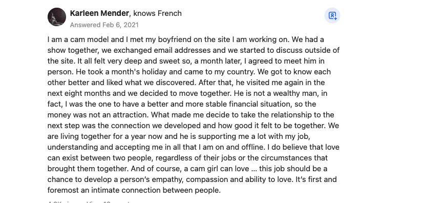 There have been instances of people meeting their significant others through the cam site they worked for. In fact, there was a post about it on Quora. Who knows? It could very well happen to you. But keep in mind, at the end of the day, these girls are just doing their job, so don’t hassle them if they’re not interested and real-life relationships are very rare.