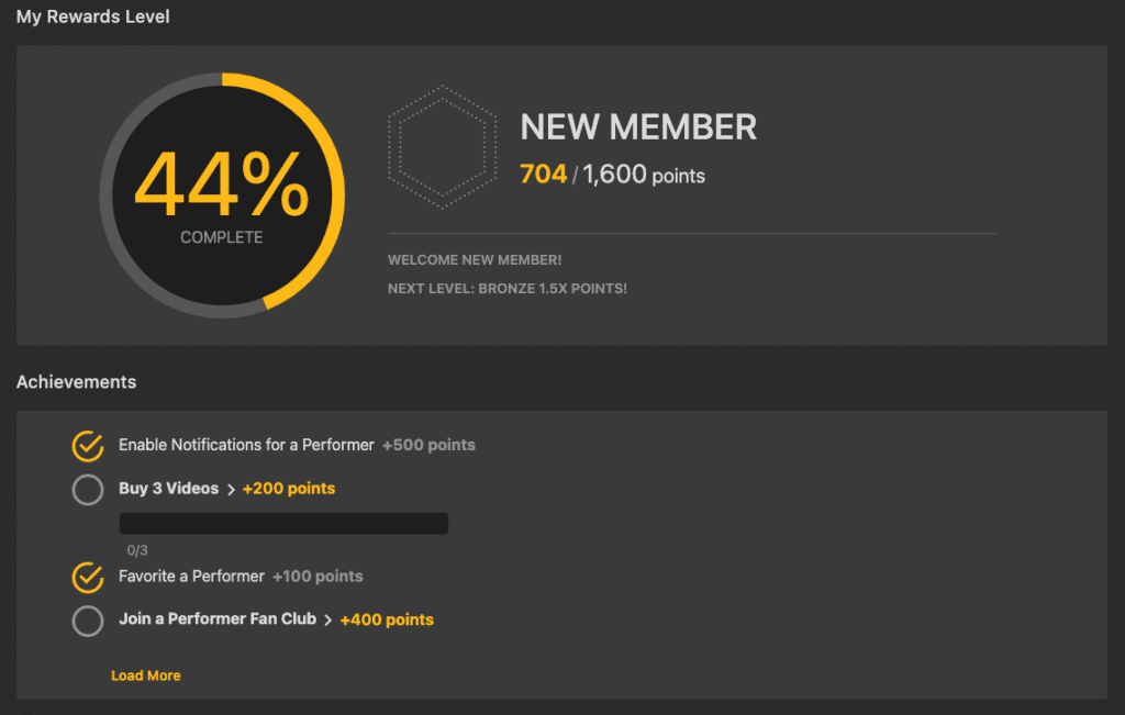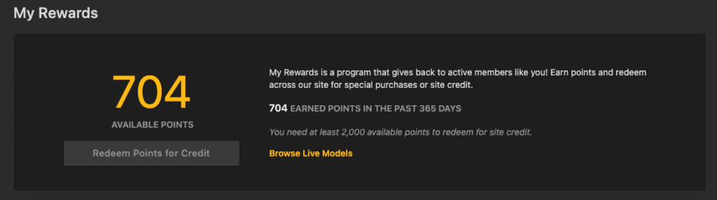 These kinds of initiatives help models and members engage more intimately. After all, they’re beneficial for everyone involved. Suppose you’re looking for your existing points or want to get more, head to the My Rewards page from the site menu. Here, you’ll see your points count, which loyalty level you’re sitting at, and what other achievements you still have to conquer.