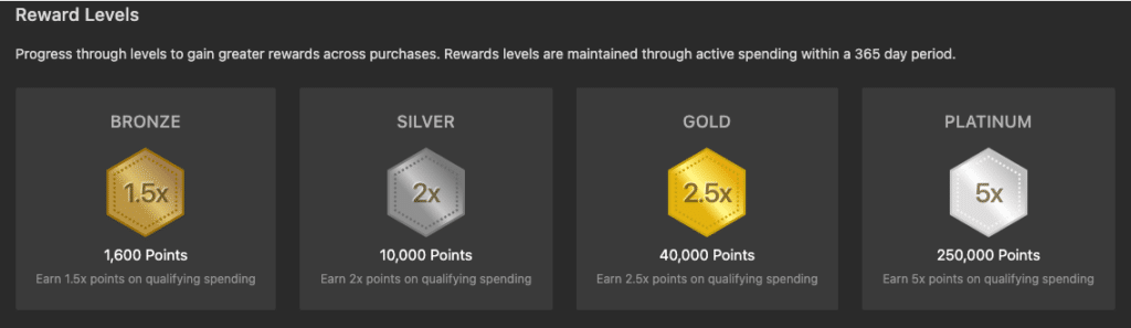 For example, a Bronze level member earns 1.5x the points when they make a purchase. A Platinum level member, which is the highest you can achieve, can earn 5x the points on qualified spending. To reach Platinum, you’ll need to accumulate 250,000 points within 365 days so that will take some commitment. But even if it’ll be no small feat, it’ll be so worth it in the end!